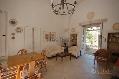 casa fine 1800 nella campagna salentina a 14 km dal mare, tra Cutrofiano e Aradeo. Terreno mq.17000 comprensivo di 4000mq di giardino. Casa di 170 mq comprende: salone, grande cucina abitabile, 4 camere da letto matrimoniali, 2 bagni, aria condizionata, stufe e camino, 2 cancelli carrabili, pannelli fotovoltaici, pozzo artesiano, porta blindata, campo di calcetto, porticato in pietra con travi in legno e pergolato per pranzi e cene all'aperto. Ottimamente collegata nelle vicinanze con tutti i servizi necessari. Splendidamente arredata, può essere adibita ad abitazione privata o come struttura ricettiva grazie ai 12 posti letto disponibili.