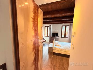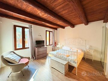 Salendo ai piani superiori, il fascino diventa protagonista: due ampie camere matrimoniali con travi a vista, pareti in sasso e una suggestiva doccia a vista regalano atmosfere calde e ricercate. Ogni piano dispone inoltre di un elegante bagno finestrato.