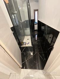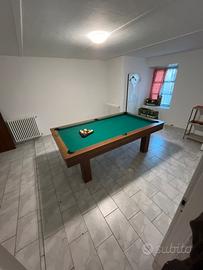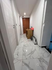 L'ingresso si presenta sul soggiorno e cucina, divisi ma collegati, e il primo bagno.