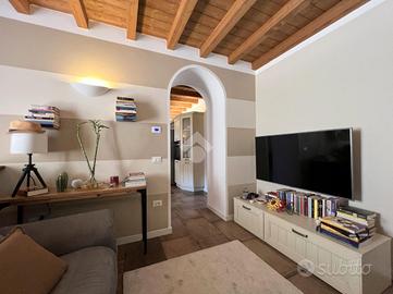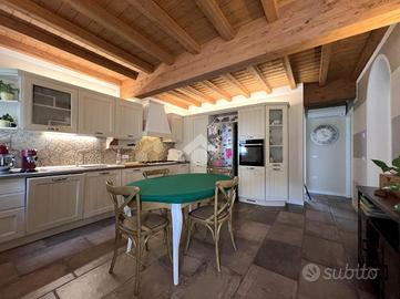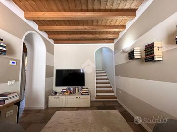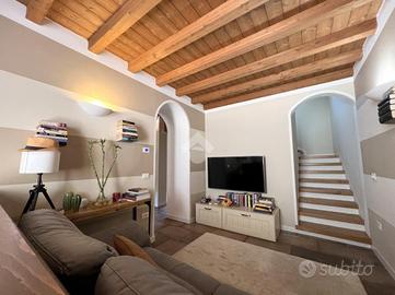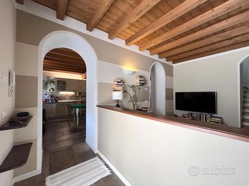 Al piano terra sono inoltre presenti un bagno finestrato con doccia e un comodo sottoscala finestrato, ideale come spazio di deposito. L'ambiente della zona giorno è reso ancora più caldo e accogliente grazie al soffitto con travi a vista in legno.