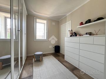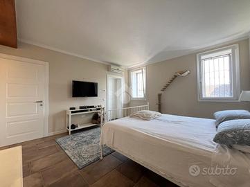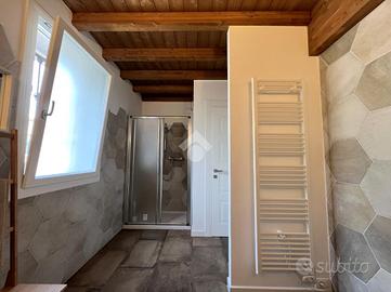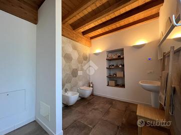 Salendo la scala interna, rivestita in pregiato rovere massello, si raggiunge il primo piano dove troviamo una spaziosa camera matrimoniale con grande cabina armadio e un bagno padronale finestrato con doccia, anch'esso con travi a vista in legno.
