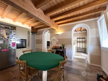 Dalla cucina, attraverso due eleganti archi, si gode della vista sull'ingresso e sull'intera zona del soggiorno, creando un'atmosfera aperta e conviviale.