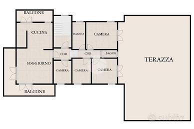 1° piano: appartamento con soggiorno, cucina, quattro camere, due bagni, balcone e terrazzo di 150mq.