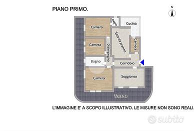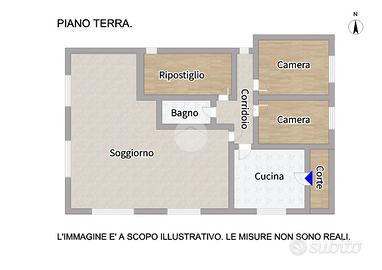 Al piano terra troviamo un trilocale con ampio soggiorno, cucina separata con accesso alla corte, due camere matrimoniali, bagno con doccia e ripostiglio finestrato.