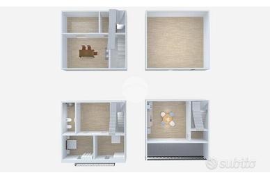 - Unità 2: Palazzina indipendente, di 40 metri quadrati per piano, composta da piano terra con ingresso su soggiorno, camera, anti-bagno e bagno, primo piano con ingresso, due camere da letto e bagno; secondo piano con cucina-soggiorno, ripostiglio e terrazzo di 10 metri quadrati.