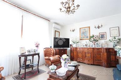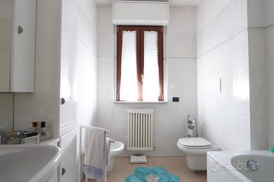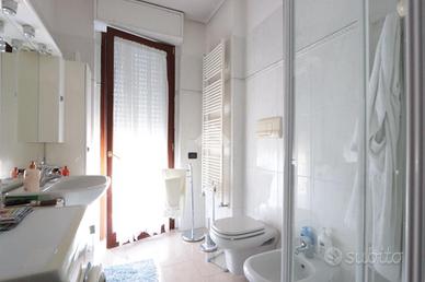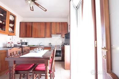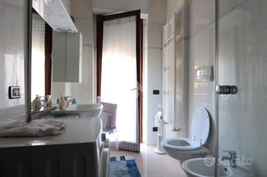 cucina abitabile con balcone, due camere matrimoniali e doppi servizi, uno con doccia, uno con vasca e balcone.