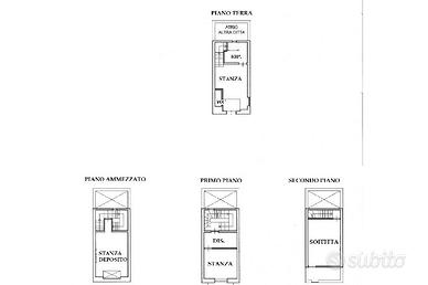 La soluzione è composta da due locali con servizio a piano terra, un vano deposito a piano ammezzato, piccolo disimpegno con una stanza servita da balcone al primo piano e sovrastante soffitta con terrazzino.