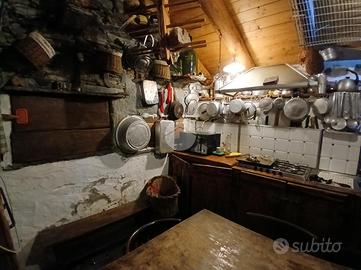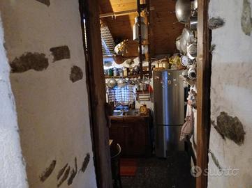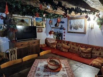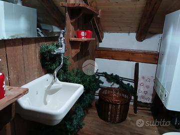L'accesso alla zona abitativa invece avviene tramite il terrazzino e ci si ritrova immediatamente nella grande zona giorno in perfetto stile rustico e tipico di montagna. Successivamente troviamo due camere da letto, una matrimoniale e una singola, e scendendo la scala troviamo la cucina abitabile anch'essa in perfetto stile montano.