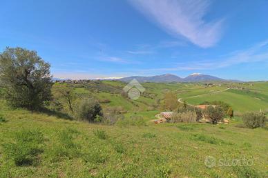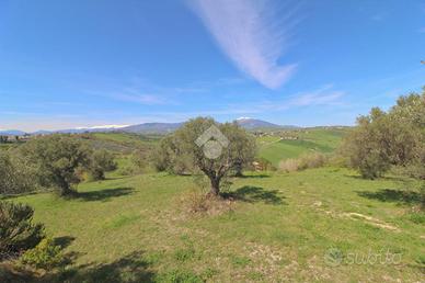 Un terreno agricolo parzialmente pianeggiante con una vista mozzafiato sulla maestosa catena montuosa del Gran Sasso.