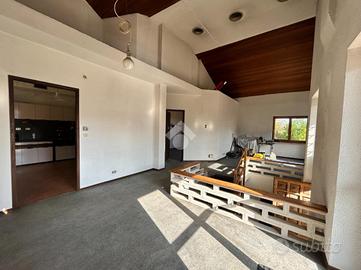 Salendo al primo piano, si apre la zona giorno, composta da un luminoso soggiorno, una cucina abitabile, una sala da pranzo, un bagno finestrato e una camera da letto con annessa cabina armadio/studio.