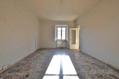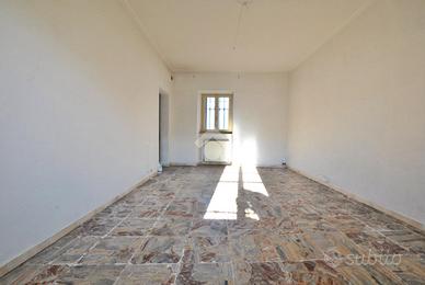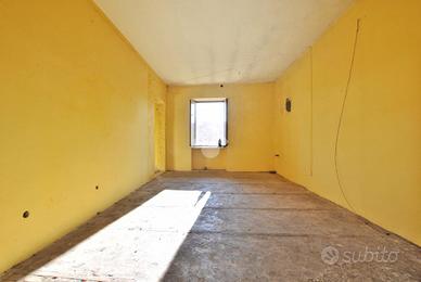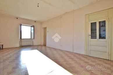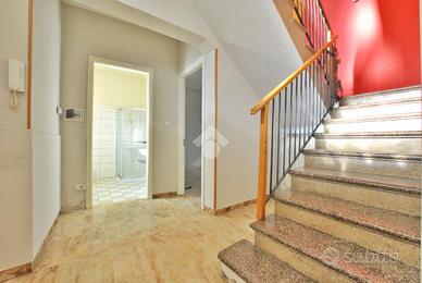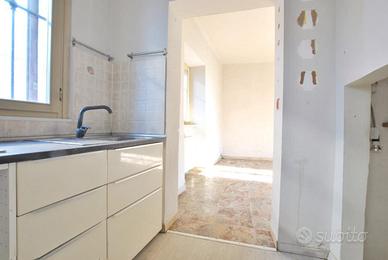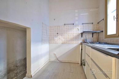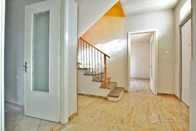 La soluzione si sviluppa su due livelli fuori terra. L'accesso avviene tramite l'ingresso carraio collocato su Via Mazzini; oltrepassato l'androne, si giunge nel cortile di proprietà. La porta d'ingresso blindata si apre su un ampio vano disimpegno, con scala a vista, che mette in comunicazione tutti i locali del piano. Il soggiorno è ampio e luminoso, mentre la cucina, pur essendo raccolta e non abitabile, è sapientemente organizzata in un angolo dedicato. La configurazione della zona giorno ottimizza gli spazi, mantenendo l'ambiente ordinato e funzionale; inoltre, il vano sottoscala funge da pratica dispensa o ripostiglio. Il piano terra, oltre a ospitare una delle tre camere, è dotato di un bagno con doccia e attacchi per la lavatrice.