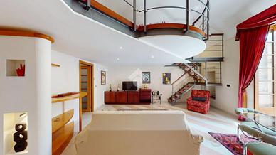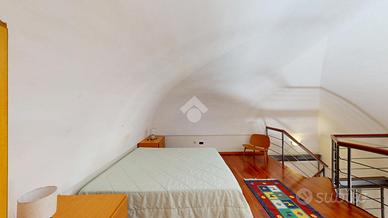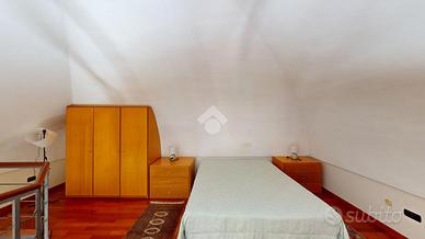 Nel soggiorno è presente una rampa di scale la quale conduce al soppalco, sopra il quale è presente la camera matrimoniale della casa.