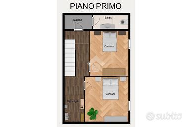 Salendo al piano primo troviamo due ampie camere da letto, un secondo vano adibito a ripostiglio ed infine accedendo dal balcone troviamo il bagno di servizio.