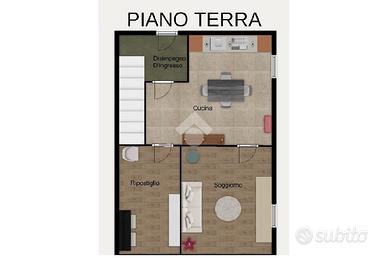 Al piano terra troviamo la cucina che resta separata dal soggiorno e sullo stesso piano troviamo anche un ripostiglio cieco.