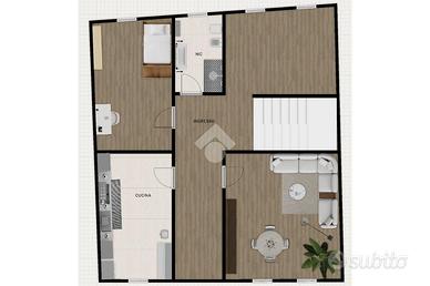 L'abitazione è composta da: ingresso, soggiorno, cucina abitabile, lavanderia, cantina e bagno finestrato al piano terra; al piano primo sono presenti quattro camere da letto, bagno finestrato ed un balcone che si affaccia sull'ingresso; al secondo piano è presente una soffitta molto ampia.