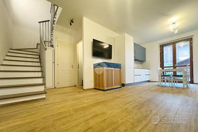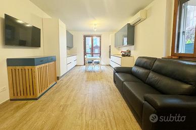 La proprietà si distingue per gli ampi spazi esterni, grazie a un giardino privato di circa 120 mq, perfettamente vivibile e ideale per momenti di relax, cene all'aperto o per chi desidera uno spazio verde esclusivo. L'immobile si sviluppa su più livelli collegati internamente. Al piano terra troviamo un luminoso soggiorno con cucina open space, un bagno finestrato con antibagno e l'accesso diretto al giardino. Scendendo al piano seminterrato si accede a una taverna adibita a sala cinema, ambiente versatile e accogliente, collegato direttamente al garage privato ed esclusivo di circa 20 mq.