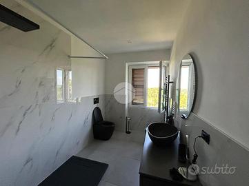 La zona notte comprende due camere da letto e due bagni, di cui uno da ultimare, garantendo comfort e privacy.
