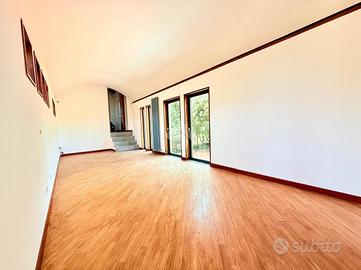 Al piano terra da soggiorno luminoso con canna fumaria, sala da pranzo con cucina e bagno finestrato.
