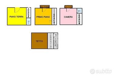 Al piano terra troviamo un ampio locale con ingresso indipendente e bagno di servizio. Accanto all'attività è presente un secondo accesso, riservato all'ingresso dell'abitazione e che conduce ai piani superiori. Il primo piano ospita una camera da letto con affaccio su balcone; al secondo piano si trova una seconda camera anche essa con balcone e un bagno, Infine al terzo piano troviamo un piccolo terrazino