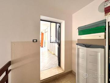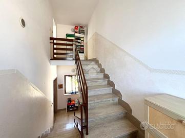 Una volta fatto accesso mediante il portone principale, tre rampe di scale ci portano al primo livello composto da: ampio soggiorno con balcone ed un disimpegno che porta alle tre camere da letto ed ai due bagni. Proseguendo le scale, con altre due rampe saliamo in cucina che è al livello con il terrazzo abitabile. Questo ampio vano di circa 37mq è attualmente in uso anche per la zona lavanderia.