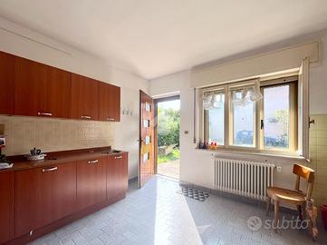 Il piano terra ospita una zona accessoria particolarmente funzionale, composta da una cantina spaziosa, perfetta come deposito o dispensa, una taverna accogliente, ideale per momenti di convivialità, al momento allestita come cucina, uno studio riservato pensato per chi lavora da casa, e un bagno di servizio finestrato, completo di vasca. Sempre al piano terra, si trova l'autorimessa, direttamente collegata alla proprietà, e un ampio giardino privato, spazio verde che offre la possibilità di vivere l'esterno in totale libertà, tra relax e attività all'aperto.