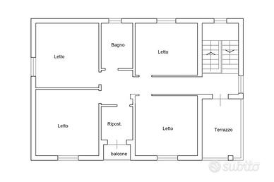 Al primo piano troviamo quattro camere matrimoniali un bagno e il ripostiglio. E' presente in oltre un terrazzo che affaccia sulla parte anteriore della casa.