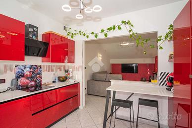 Al piano primo disponiamo la zona giorno composta da soggiorno con termocamino che scalda tutta l'abitazione, cucina abitabile con uscita su balcone.