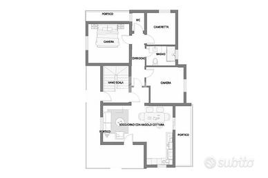 Il piano terra, di 120 mq circa, offre la possibilità di realizzare un ampio trilocale con doppi servizi, caratterizzato da portici e accesso diretto al giardino.