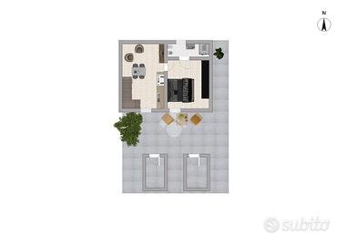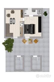 Zona giorno con cucina a vista, camera matrimoniale e bagno finestrato con doccia. Camera matrimoniale con locale sottotetto.