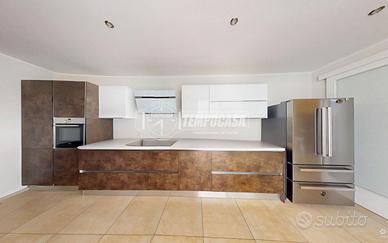 Adiacente troviamo una cucina ampia, luminosa e dal design moderno, con accesso diretto al giardino mattonato, spazio ideale per pranzi e cene all'aperto.