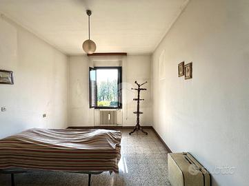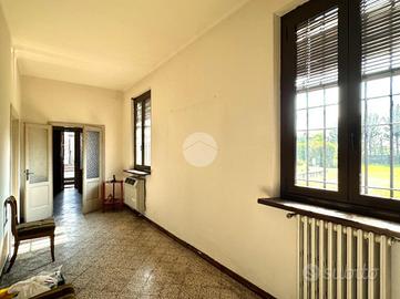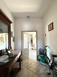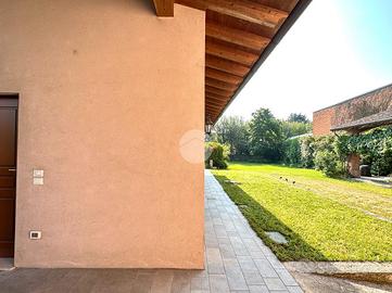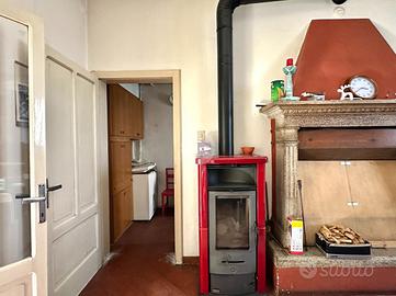 Entrando dal cancellino pedonale, frontalmente si trova l'ingresso della casa posta su due livelli mentre, sulla sinistra, il trilocale ristrutturato e l'ingresso al giardino.