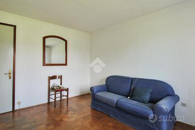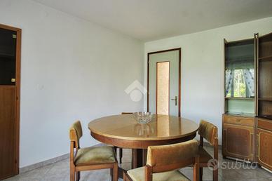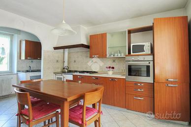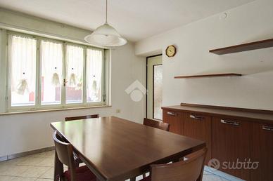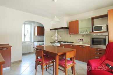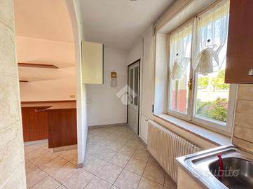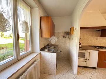 Al piano terra della porzione abitabile, troviamo un comodo disimpegno che permette l'accesso al soggiorno e alla cucina, ampia e luminosa, la quale permette a sua volta l'accesso alla cantina.
