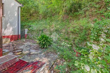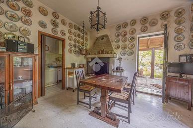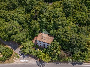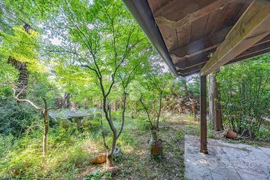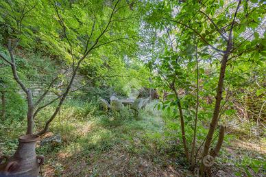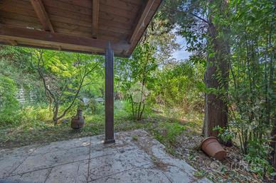 All'esterno, un porticato offre uno spazio ideale per godere delle giornate all'aperto, mentre il terreno circostante, arricchito da un bosco, regala un contatto diretto con la natura.