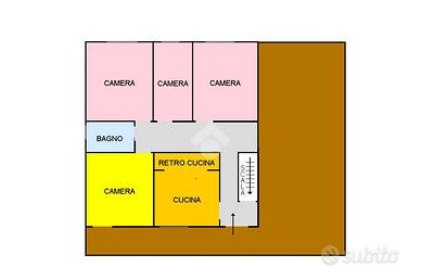 L'appartamento si sviluppa al piano primo, al quale si accede tramite scala interna, ed è composto da un ingresso che separa il soggiorno con angolo cottura e la zona notte dotata di quattro camere da letto e un bagno finestrato con vasca.