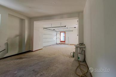 Al piano seminterrato, troviamo il box auto di 25 metri quadri, dotato di porta sezionale, e la spaziosa taverna con camino a legna.