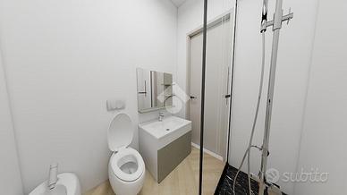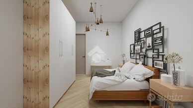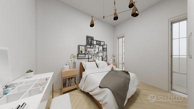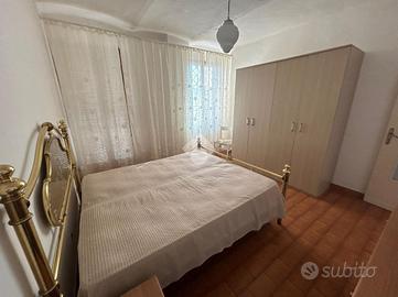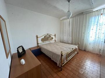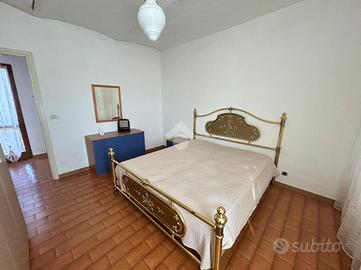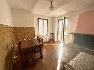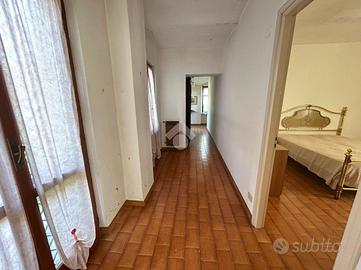 Una scala interna collega il piano primo, dove si sviluppa una seconda zona abitativa: soggiorno, cucina abitabile luminosa, bagno finestrato con box doccia e camera matrimoniale di pianta quadrata. Anche da questo piano è possibile accedere a un secondo terrazzo semiaperto, con piacevole vista sul verde circostante.