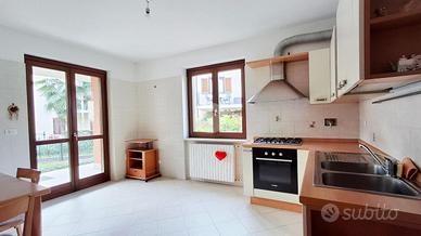Al piano terra l'ingresso conduce a un'ampia e luminosa zona giorno composta da un soggiorno, una cucina abitabile, un bagno di servizio con vasca e un locale utilizzabile come studio. Tutti gli ambienti al piano terra affacciano sul giardino di pertinenza.