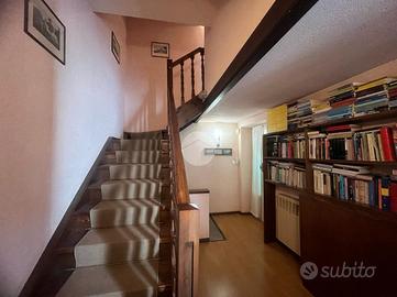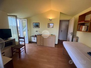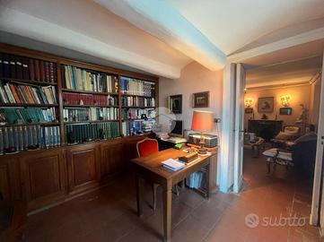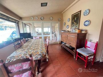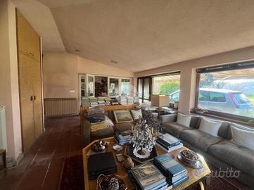 L'ingresso principale è direttamente su una spaziosa sala da pranzo verandata, ideale per trascorrere momenti di relax in famiglia. La cucina, separata e abitabile, si affaccia su un portico, mentre il salotto, arricchito da un elegante camino in muratura, contribuisce a creare un'atmosfera accogliente nella zona giorno. L'immobile, realizzato nello stile degli anni '50, comprende anche uno studio separato. La distribuzione degli spazi offre la possibilità di dividere l'abitazione in due unità indipendenti, grazie alla presenza di due ingressi autonomi, uno dei quali si trova sul retro della casa. I pavimenti sono rivestiti in pregiato cotto di Venezia.