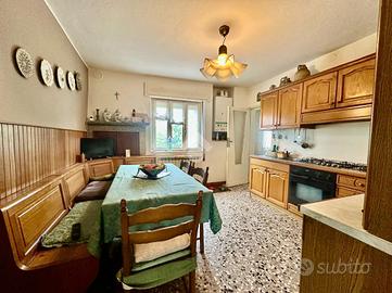Al piano terra ci accoglie un grande portico coperto. Entrando si sviluppa la zona giorno composta da soggiorno e grande cucina abitabile. Troviamo poi un grande disimpegno arredato che ci accompagna nella prima camera da letto matrimoniale e al bagno con doccia e vasca. Completa il piano un piccolo accesso con scale che portano nell'interrato dove c'è una comoda cantina.