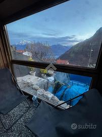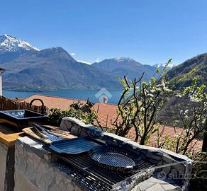 Accedendo dal terzo piano, si entra direttamente in un ampio soggiorno con cucina a vista, ambiente luminoso e accogliente, collegato a un piccolo bagno di servizio e a uno splendido balcone con vista sul lago.