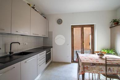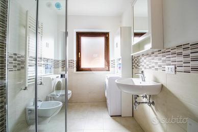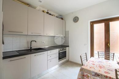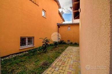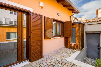 All'esterno, la proprietà dispone di una corte privata di circa 100 mq, suddivisa in una zona pavimentata e un'area verde, ideale per momenti di relax o per chi ama gli spazi all'aperto.