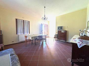 L'ingresso dell'appartamento posto al pian terreno, direttamente affacciato sul giardino, apre sull'ampio e luminoso soggiorno, a fianco del quale rimane ,separato,il cucinotto. Proseguendo tramite il disimpegno che conduce alla zona notte, troviamo le due camere, entrambe grandi matrimoniali ed il bagno, dotato di vasca.