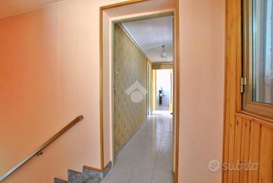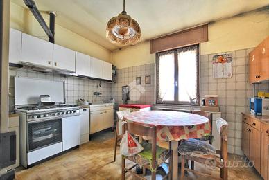 Al piano terra, i primi due locali, ugualmente accessibili dal box e attualmente utilizzati come cucina e tinello, sono collegati tra loro e si affacciano l'uno sull'altro grazie a un'apertura ad arco nel muro che dona profondità visiva e ariosità agli spazi. La sala, dotata di predisposizione per l'impianto di climatizzazione, funge da disimpegno tra una seconda cucina, una camera da letto e il vano scala che conduce al primo piano. Il primo dei due bagni risulta essere luminoso e di generosa metratura, ospitando sia la vasca che la doccia, oltre agli allacci per la lavatrice.