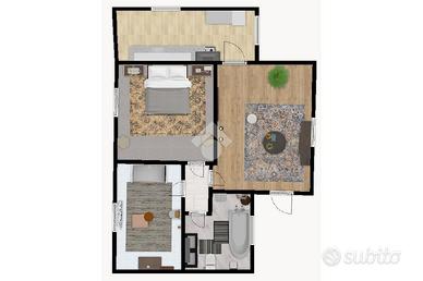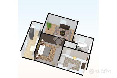 Tramite ingresso pedonale e superato il portico troviamo la graziosa zona giorno e la cucina separata abitabile. Proseguendo, un disimpegno centrale permette l'accesso alla camera matrimoniale, allo studio ed al bagno cieco con impianto di aerazione e sanitari in ceramica.