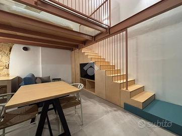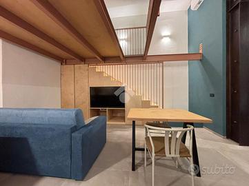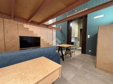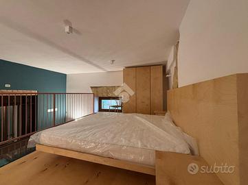 Dal soggiorno, tramite una scala in legno, si accede alla camera da letto soppalcata. Il bagno, ben disimpegnato, invece, è servito da doccia a filo pavimento.