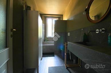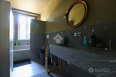 Salendo le scale in pietra si accede al piano superiore dove si trova un ampio locale open space attalmete diviso con armadiatura su misura in due ambienti - camera da letto e angolo relax/studio, il bagno padronale dotato di una doccia/vasca perfetta per ogni esigenza ed un piccolo sgabuzzino.