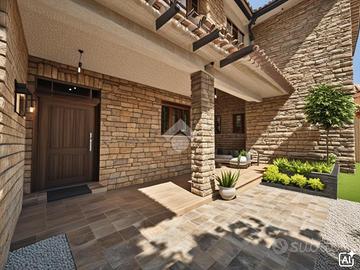 A piano terra, tramite portico d'ingresso, accediamo all'abitativo, composto da: ampio disimpegno, salone, uno studio, zona lavanderia, un bagno di servizio, cucina, cantina e collegamento interno ad ampio garage.