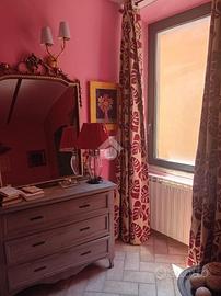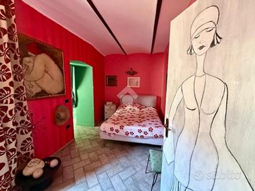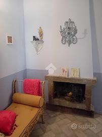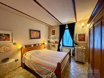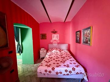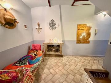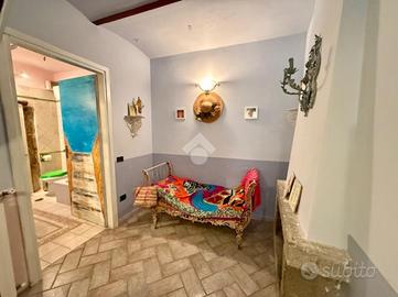 Il piano superiore ospita due camere da letto, un ampio disimpegno con camino, un bagno con vasca e uno studio ricavato all'interno di un suggestivo arco antico che caratterizza la via.