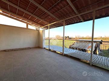 Tramite scala interna si accede al piano superiore composto da un soggiorno con ripostiglio adiacente, due camere da letto matrimoniali, uno con affaccio sul balcone e l'altro su un ampio terrazzo.