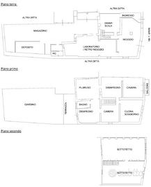 Negozio ed autorimessa al piano terra, abitazione al primo piano oltre a locali deposito/magazzino al piano terra.